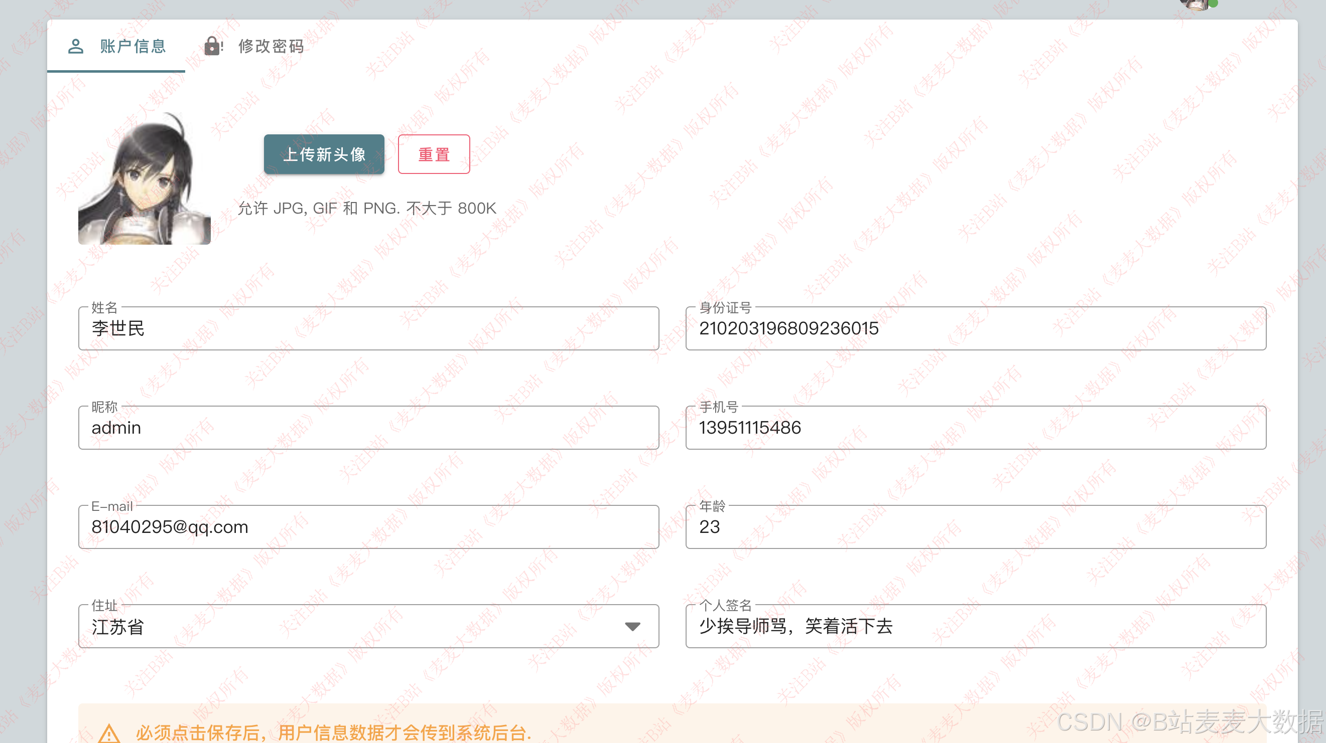 用户信息修改中可以上传头像,完成用户的头像个性化设置,也可以修改用户其他信息。