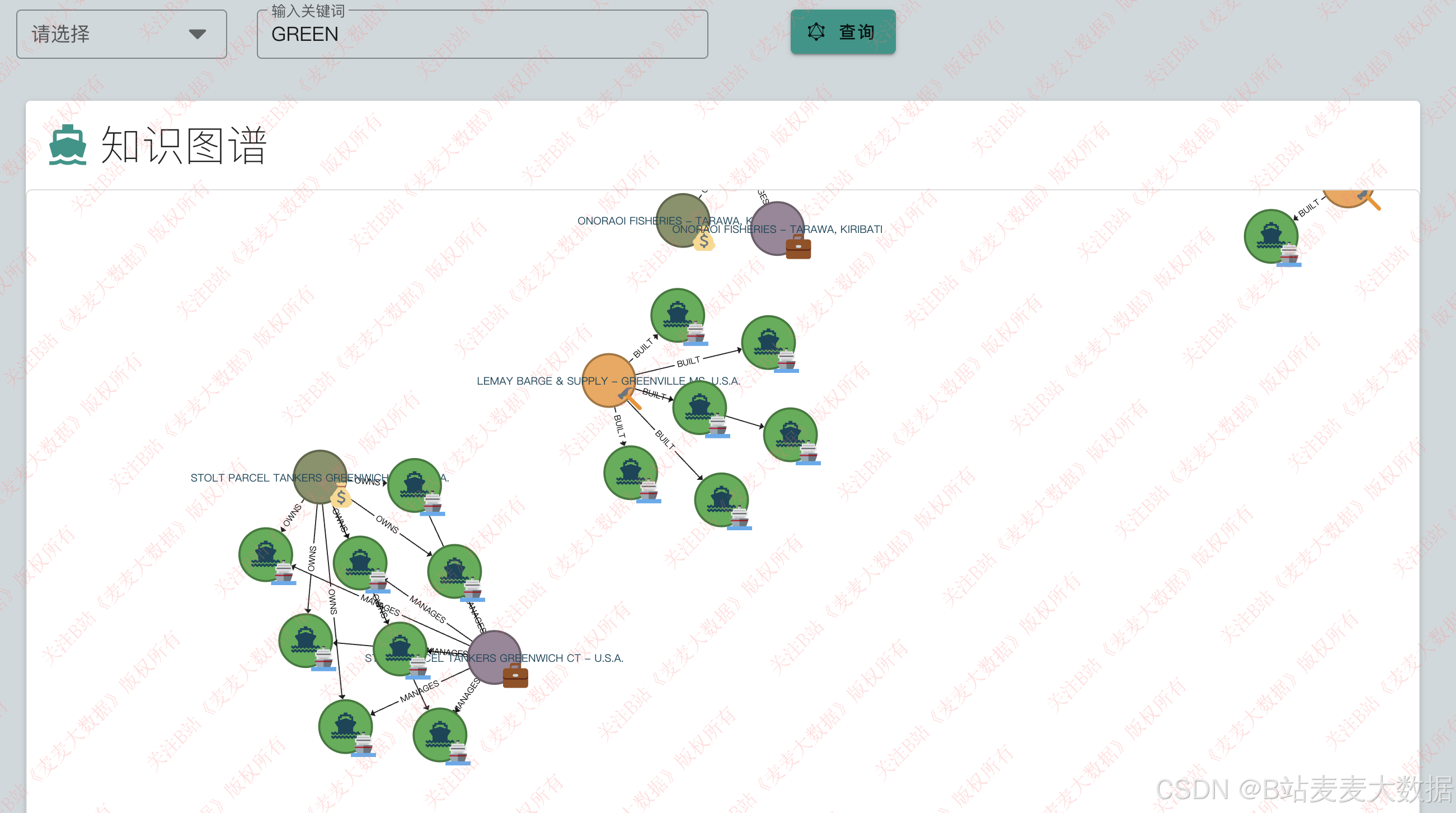 系统提供自然语言输入接口(如"哪些船是油轮?"),前端将用户提问通过NLP技术(如关键词提取或BERT语义理解)转义成Cypher查询语句,调用后端接口执行图谱查询,返回结构化信息或图表。