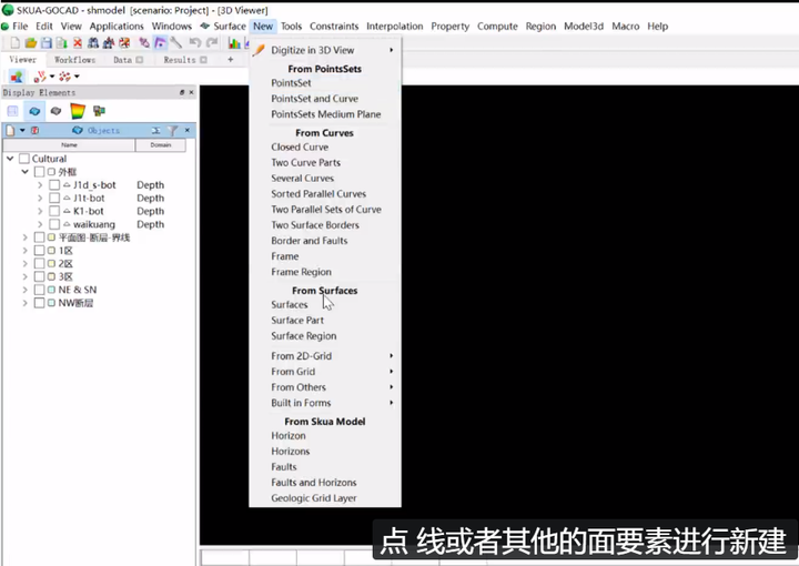 New子菜单里显示从点集、线和面及其他模型创建面。