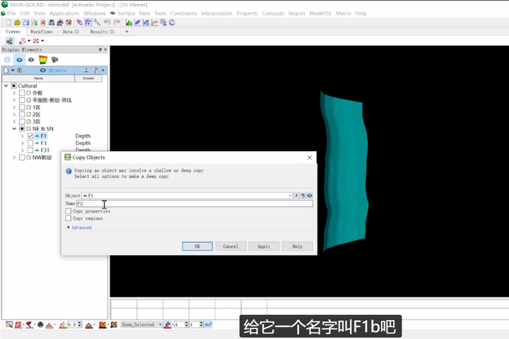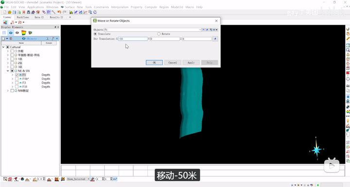 假设断层厚度为100m,首先复制断层面,将其中1个向左平移50m,另1个向右平移50m。