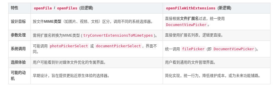 一个非常有趣的设计是,该类中同时存在 openFile/openFiles 和 openFileWithExtensions/openFilesWithExtensions 两组功能相似的方法。这并非冗余,而很可能代表了接口的演进与兼容性策略。