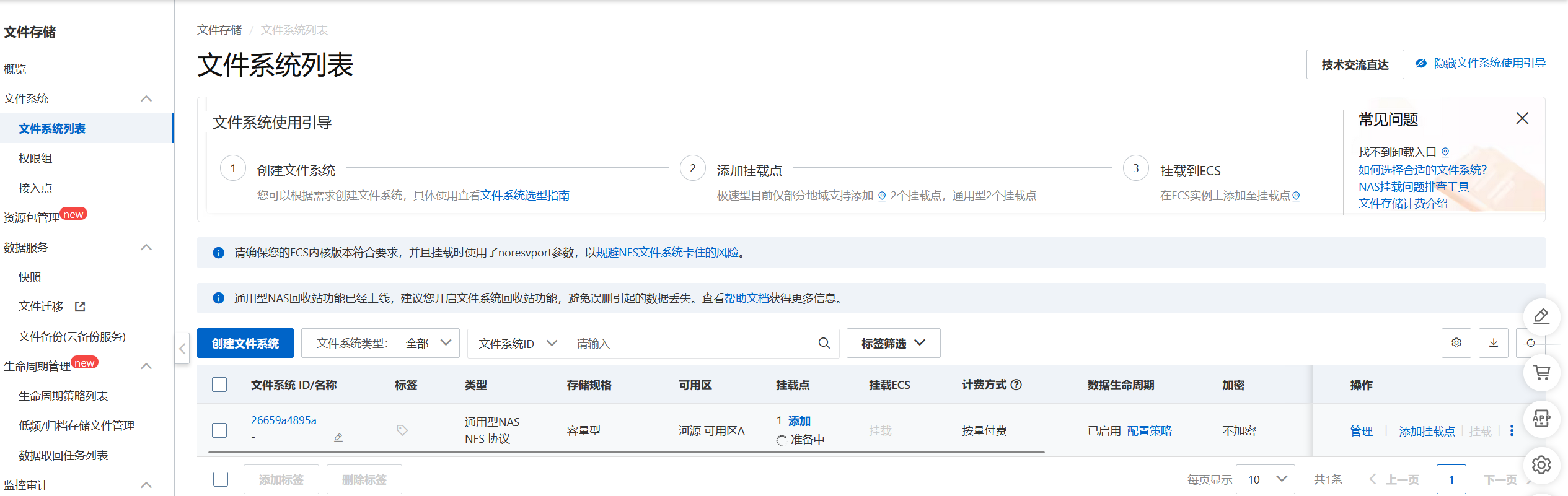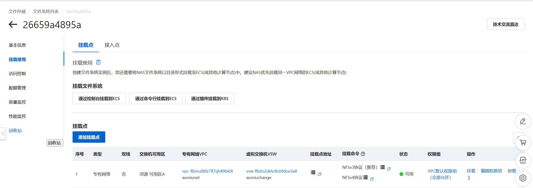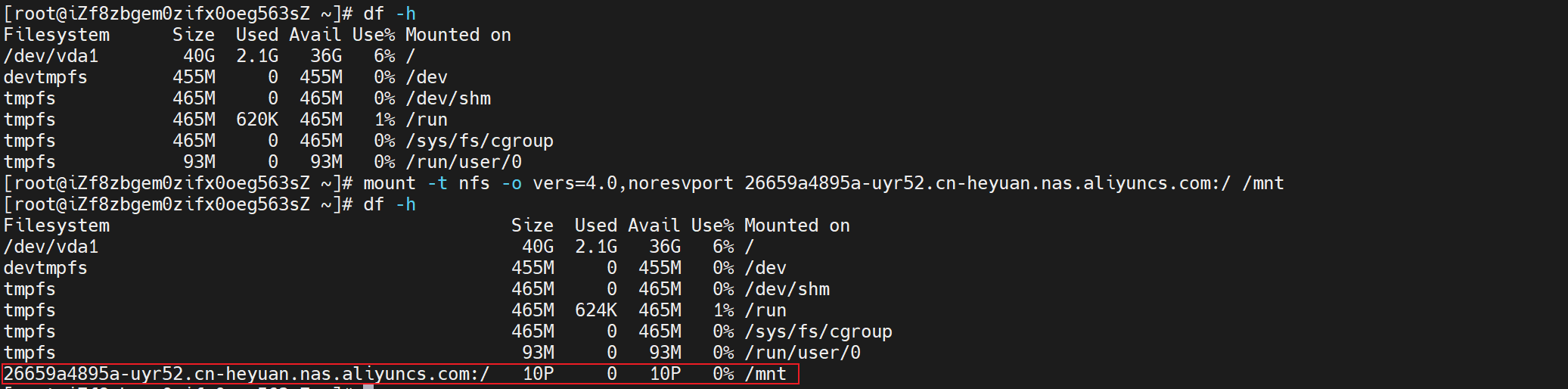 [root@iZf8zbgem0zifx0oeg563sZ ~]# mount -t nfs -o vers=4.0,noresvport 190e7c4a797-cdn7.cn-chengdu.nas.aliyuncs.com:/ /mnt