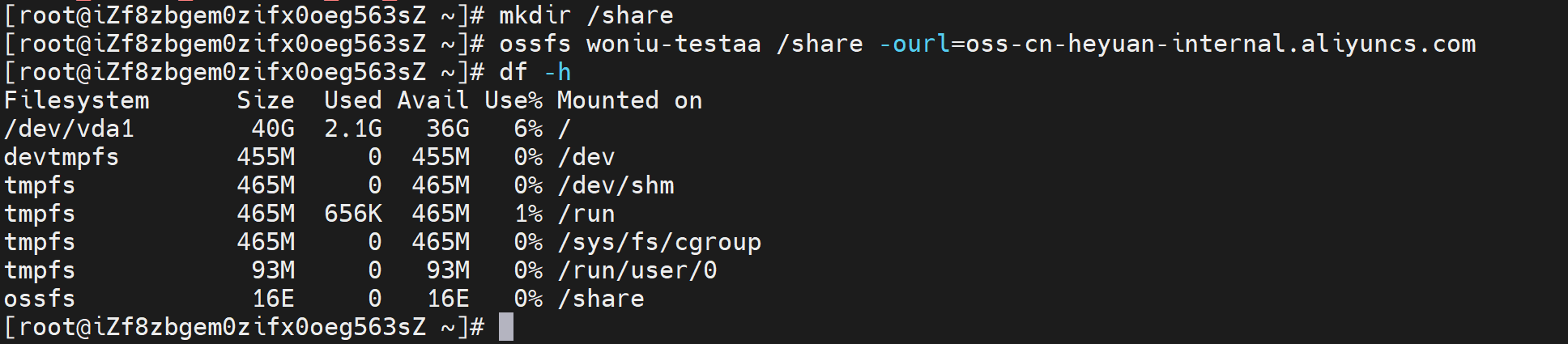ossfs woniutest01 /share -ourl=oss-cn-chengdu-internal.aliyuncs.com # 挂载使用