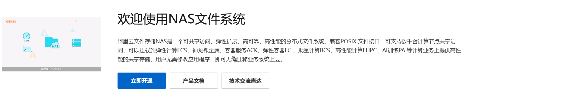 阿里云文件存储NAS是一个可共享访问,弹性扩展,高可靠,高性能的分布式文件系统。兼容POSIX 文件接口,可支持数千台计算节点共享访问,可以挂载到弹性计算ECS、神龙裸金属、容器服务ACK、弹性容器ECI、批量计算BCS、高性能计算EHPC,AI训练PAI等计算业务上提供高性能的共享存储,用户无需修改应用程序,即可无缝迁移业务系统上云。