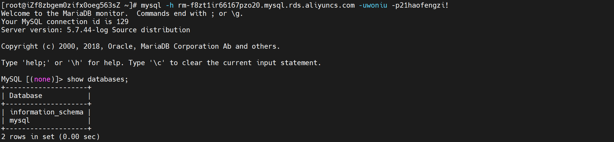 [root@iZf8zbgem0zifx0oeg563sZ ~]# mysql -h rm-f8zt1ir66167pzo20.mysql.rds.aliyuncs.com -uwoniu -p123