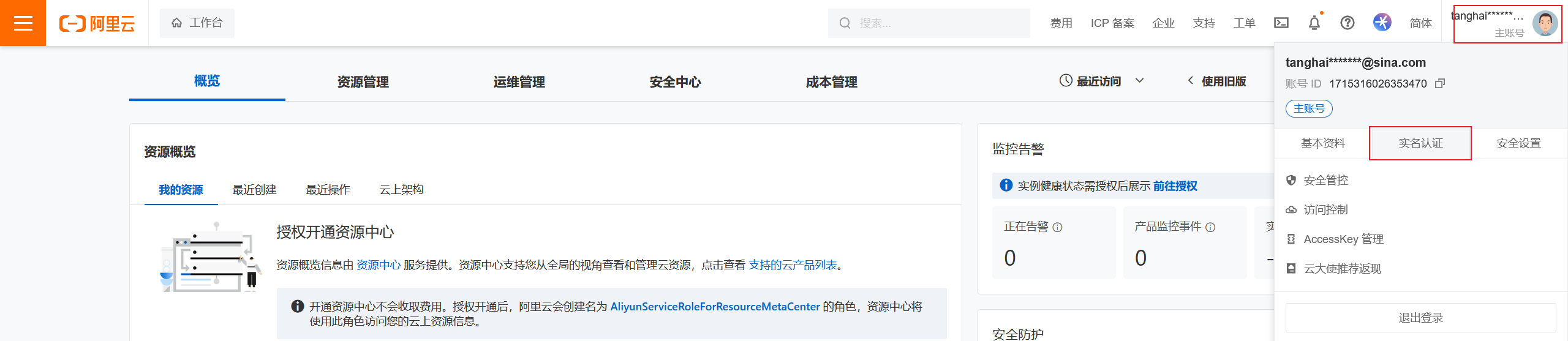 阿里云APP,方便扫码登录,方便快捷安全登录进去之后,进入控制台,需要进行实名认证操作