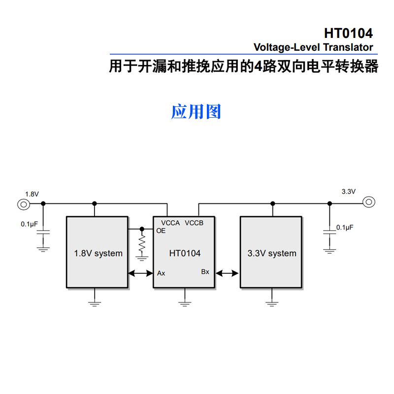 除了基础的供电与模式控制设计,HT0104还具备多项突出特点,进一步提升了其使用便捷性与可靠性。其一,无电源时序要求,这是该器件的一大亮点------VCCA和VCCB两个电源可以任意一个优先斜升,无需严格遵循固定的上电顺序。这一特性极大简化了系统的电源设计流程,降低了电路调试难度,避免了因电源时序错误导致的器件损坏。其二,支持双向电平转换且无需方向控制信号。传统电平转换器往往需要额外的方向控制引脚来确定信号传输方向,而HT0104可根据两端信号的电平差异自动实现双向传输,不仅减少了主控芯片的IO口占用,也让电路设计更简洁。其三,具备优异的传输性能,最大数据速率根据输出模式有所不同:在推拉输出模式下,最大数据速率可达24Mbps,能够满足中高速信号传输需求;在开漏输出模式下,最大数据速率为2Mbps,可适配低速串行通信场景。其四,具备VCC隔离保护功能,当VCCA或VCCB任一电源被拉到地时,对应的端口会立即呈现高阻态,有效避免了因单一电源故障导致的整个系统信号紊乱,提升了系统的抗故障能力。