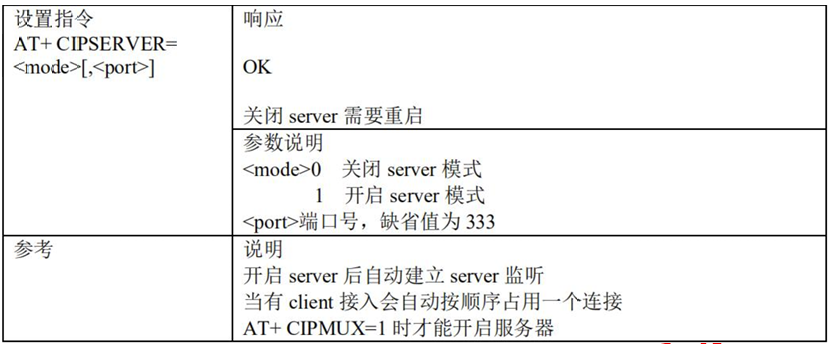 - 7)、AT+CIPSERVER:配置为服务器