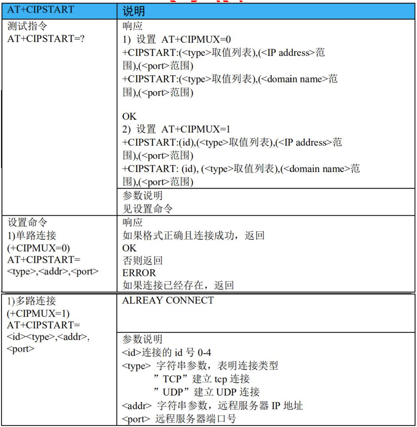 - 2)、AT+CIPSTART:建立TCP 连接或注册 UDP 端口号