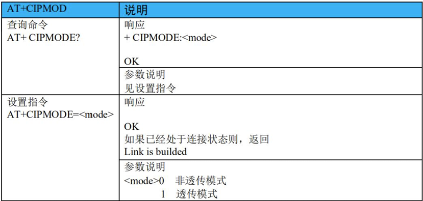 - 8)、AT+CIPMOD:设置模块传输模式