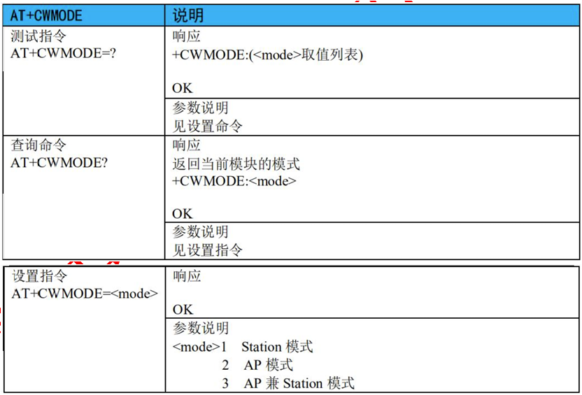 - 1)、AT+CWMODE:选择 WIFI 应用模式