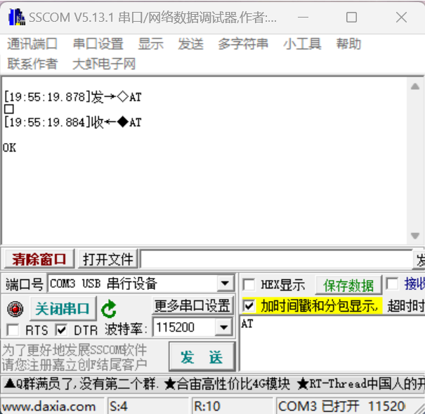 打开串口调试窗口,输入AT回复OK说明模块可以正常使用: