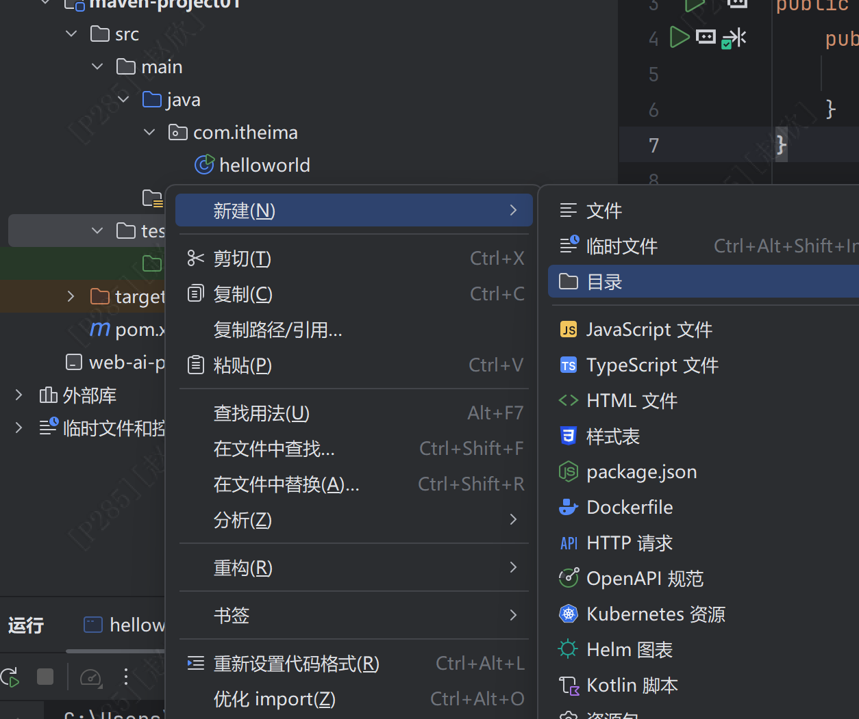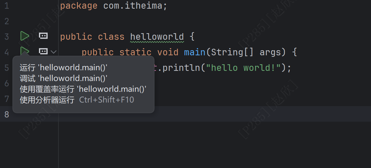 在java处右击新建java类,直接输入com.itheima.helloworld即可自动生成如下内容