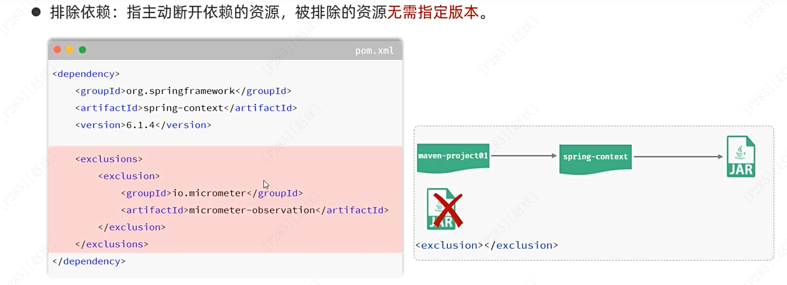 由于在下载依赖时,除了指定的资源,还会下载一些其他的,如果不想用其他的依赖,可以对其进行排除,切记,这个要放在dependency的结束标签前!!!