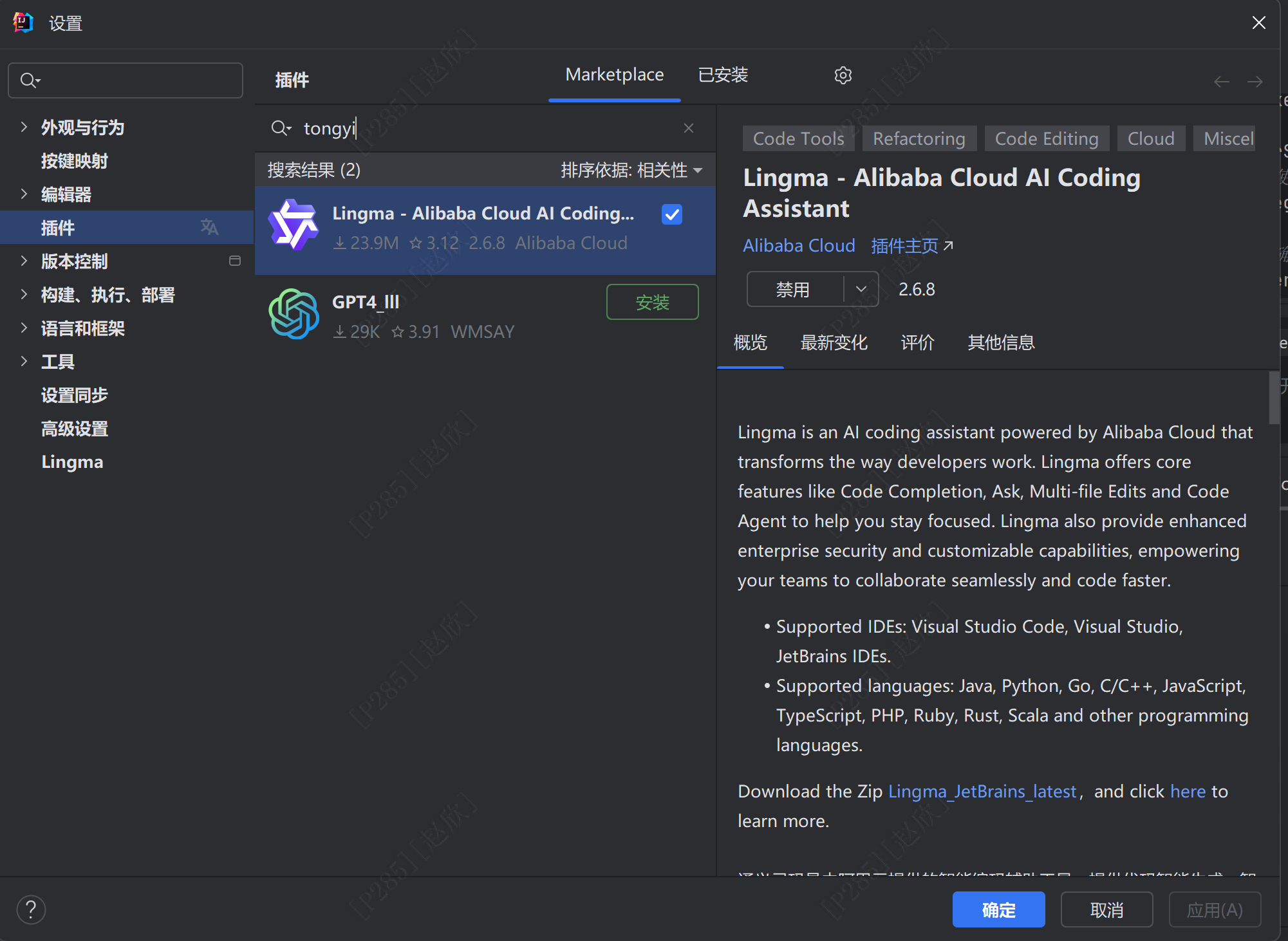 之后使用通义进行ai生成单元测试,在market中输入:tongyi,下载安装即可