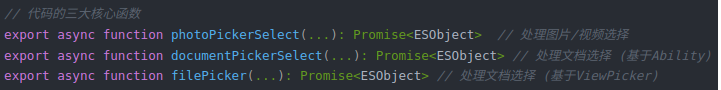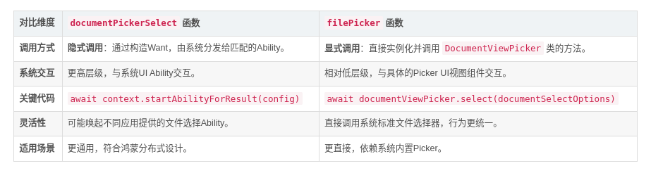 documentPickerSelect 和 filePicker 函数都用于选择普通文档,但它们的实现代表了调用鸿蒙系统能力的两种不同范式。