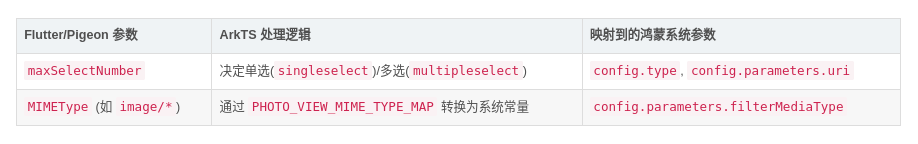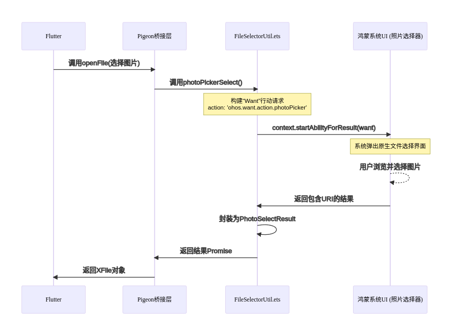 - 核心职责:对接鸿蒙原生文件选择能力,将Pigeon协议请求转化为系统调用