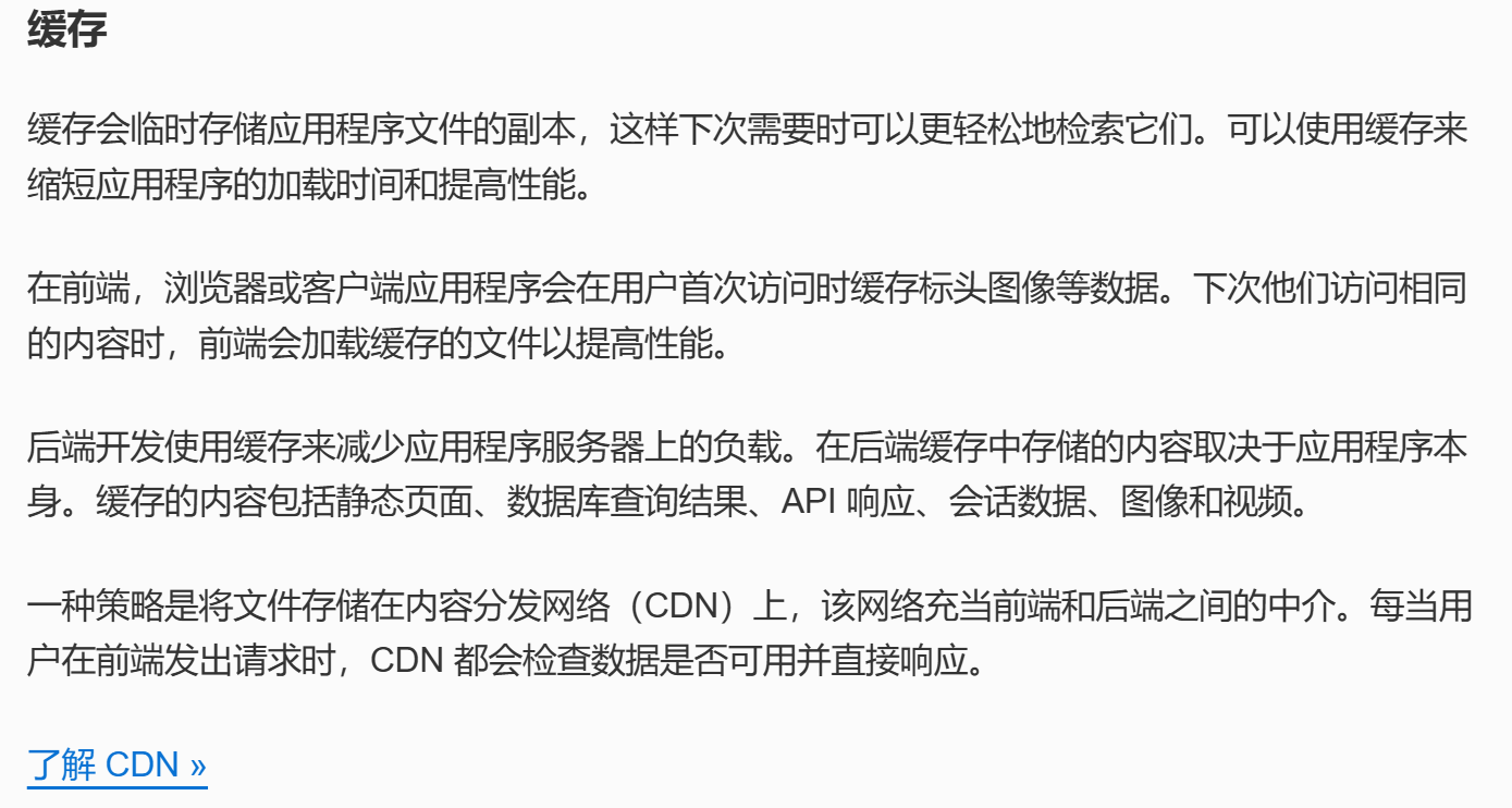 | 缓存 | 浏览器或客户端应用程序缓存应用程序中的文件并使用它们来提高性能。 | 后端系统在不同的服务器或 CDN 中缓存文件。 |