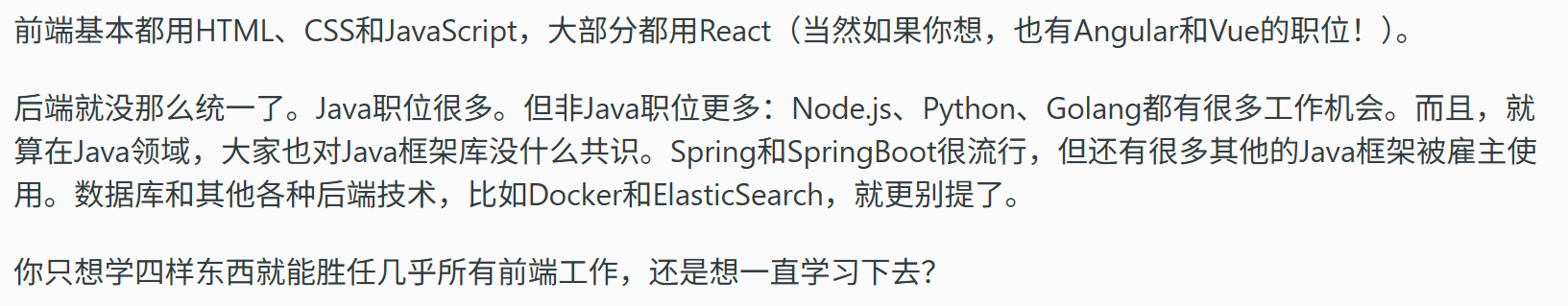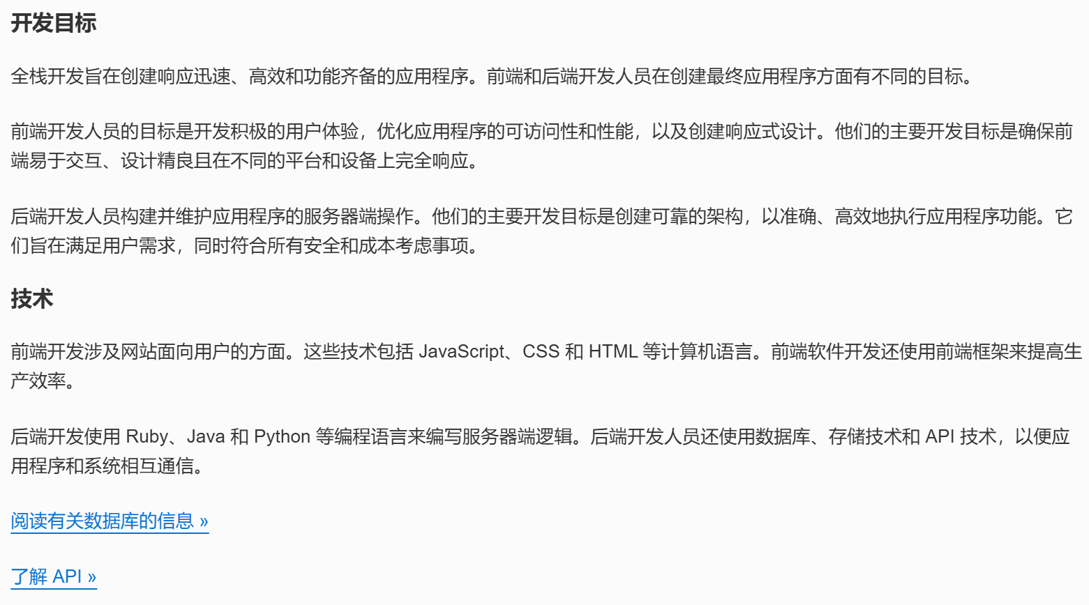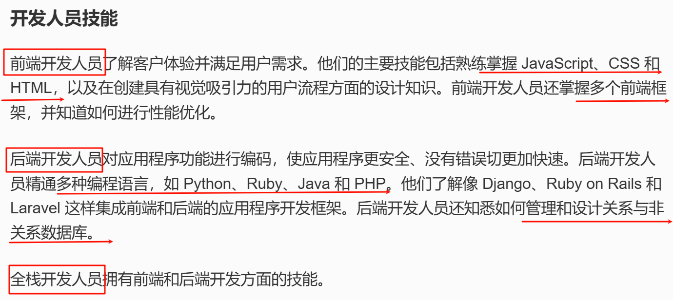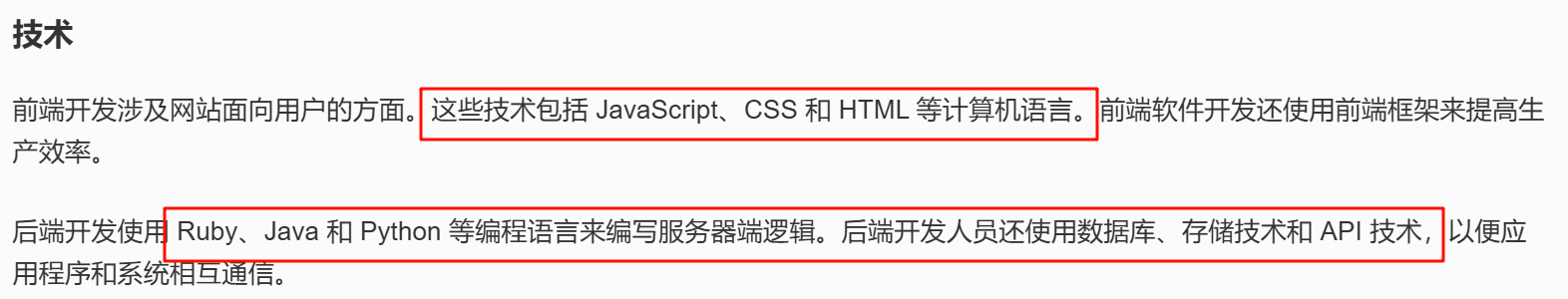 | 技术 | 前端使用 HTML、CSS、JavaScript 和前端框架。 | 后端使用 Java、Python、Ruby、API 和数据库管理系统等编程语言。 |