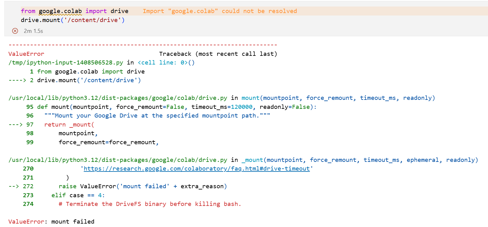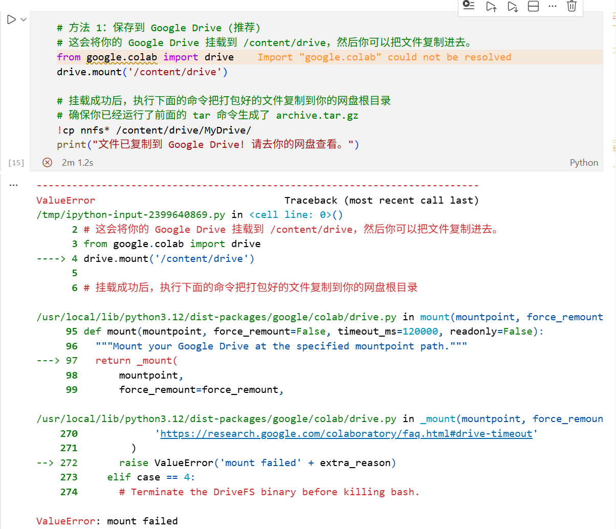 - 运行环境的差异:VS Code 是一个本地运行的代码编辑器,而 Colab 扩展在 VS Code 中运行时,其运行环境与 Colab 网页版的云端环境不同。在 VS Code 中,没有 Colab 网页版那样的后端服务来支持挂载 Google Drive 的操作,因此无法直接使用 Colab 网页版的挂载机制。