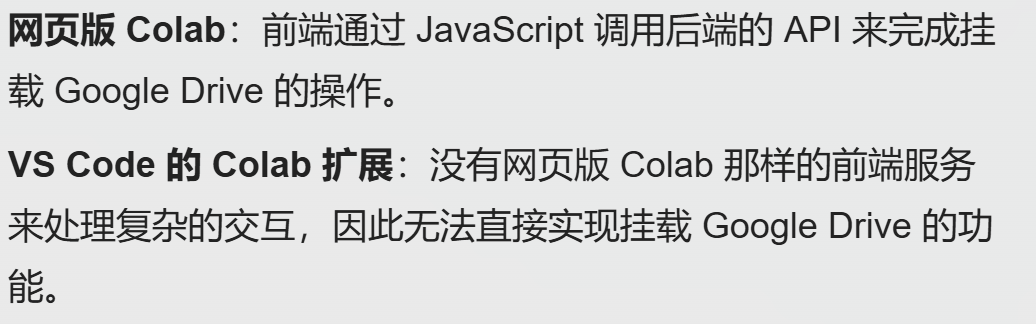 - VS Code 的 Colab 扩展:VS Code 的 Colab 扩展没有网页版 Colab 那样的前端服务来处理这种复杂的交互。它只能通过 Jupyter Notebook 的协议与后端通信,而这种协议不支持直接调用挂载 Google Drive 的 API。因此,VS Code 的 Colab 扩展无法直接实现挂载 Google Drive 的功能。