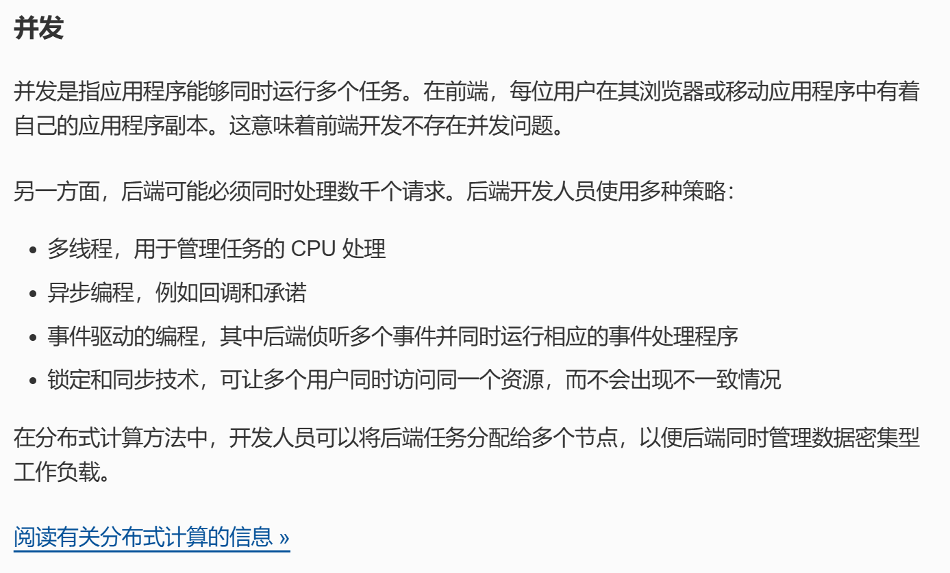 | 并发 | 每位用户都有自己的应用程序副本,因此前端不必处理并发问题。 | 后端使用多种策略同时处理成千上万的用户请求。 |