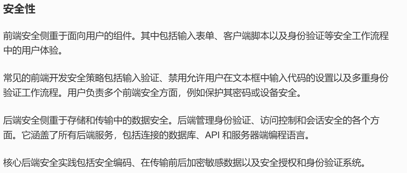 | 安全性 | 主要由用户负责前端开发中的安全性。前端开发人员主要关注用户输入验证和用户身份验证工作流程。 | 后端开发中的安全性更加全面,可以保护数据库、后端服务和应用程序本身。使用加密、安全身份验证系统和安全编码实践实现此安全性。 |