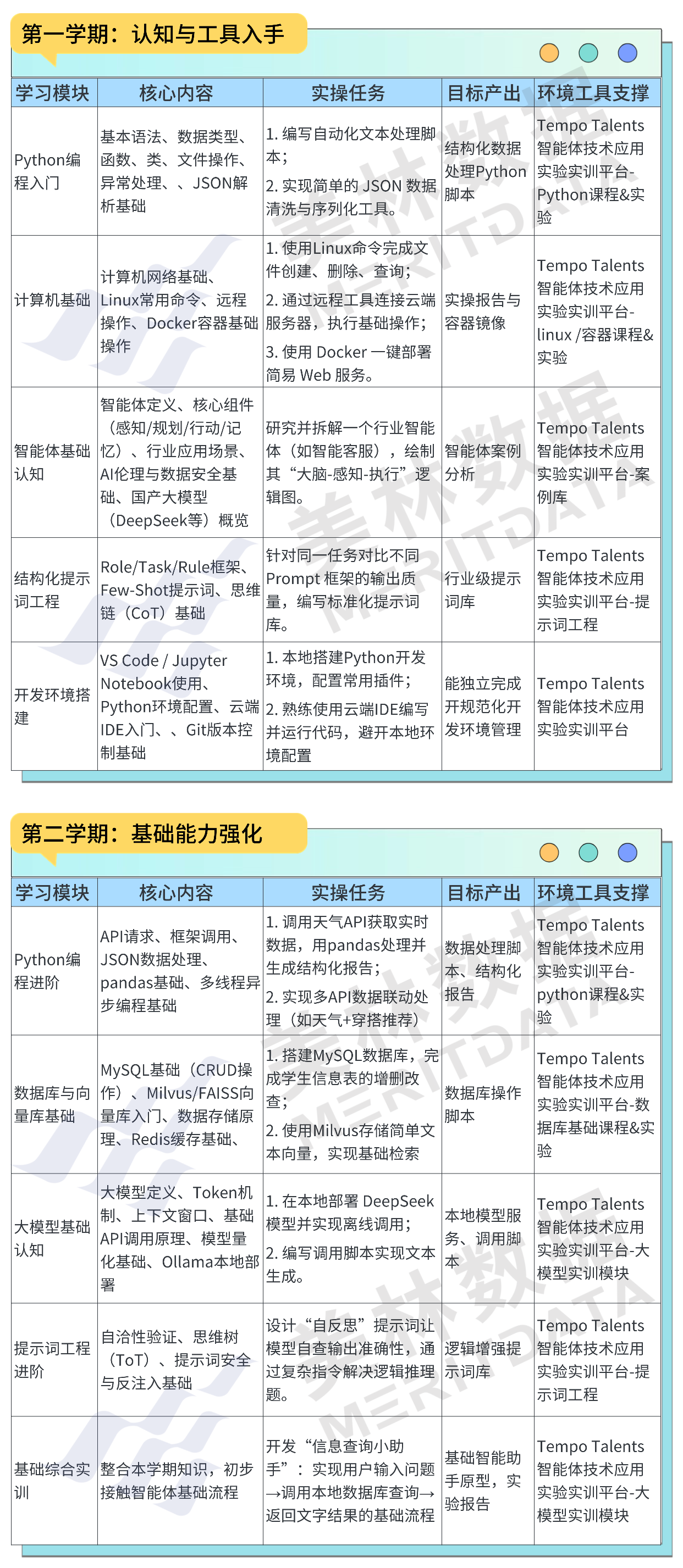 在技能培养上,重点夯实学生的实操能力,使其熟练掌握Python编程、数据库基础操作等通用技术,精通大模型API调用、提示词优化、LangChain等主流智能体开发框架使用方法,具备智能体工具集成、记忆系统搭建、多模态交互基础开发等核心能力。同时,注重培养学生的场景适配能力,使其能结合制造、金融、教育等不同行业需求,完成智能体的部署、调试、运维及简单定制开发,可独立解决项目落地过程中的常见技术问题。