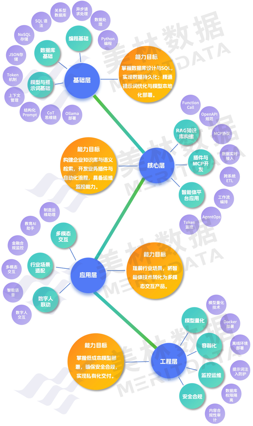 聚焦"调用-集成-调试-运维"核心工程技能,按"基础夯实(多维数据库与编程)→核心突破(RAG知识库与MCP插件)→行业适配(Text-to-SQL与业务编排)→实战落地(离线部署与AgentOps运维)"四阶段递进,每阶段配套企业真实场景实操任务,实现"学习-实训-就业"无缝衔接,同时引入"以赛促学·以证促学"的方式,夯实安全合规与工程交付能力,打通精准就业最后一公里。