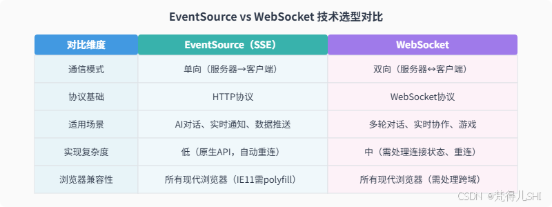 Spring AI 流式响应的前端集成主要有两种方案:EventSource(SSE)和 WebSocket。两者基于不同的通信模式,适用于不同的业务场景,下面详细解析其实现方式和技术选型。