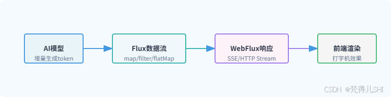 Spring AI 的流式响应本质上是通过 Flux 数据流承载 AI 模型的增量输出,其处理流程如下: