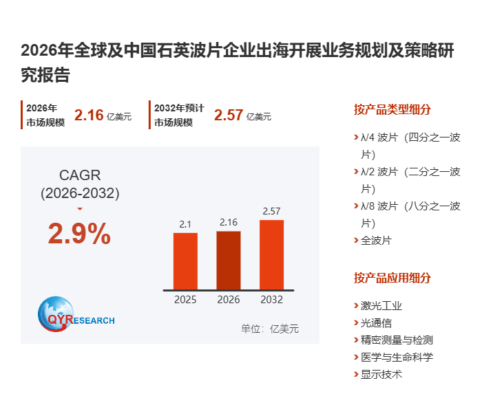 根据QYResearch调研,2025年全球石英波片市场销售额达到了2.10亿美元,预计2032年市场规模将为2.57亿美元,2026-2032期间年复合增长率(CAGR)为2.9%。这份市场报告通过梳理近年行业数据发现,石英波片市场的增长并非单一领域驱动,而是多应用场景协同发力的结果,其中激光加工、光学通信及航空航天领域的需求贡献占比合计超过60%。