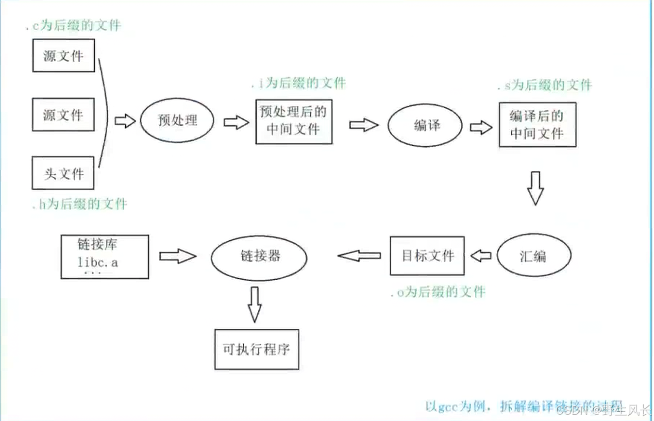 其实翻译环境是由编译和链接两个⼤的过程组成的,⽽编译⼜可以分解成:预处理(有些书也叫预编译)、编译、汇编三个过程。