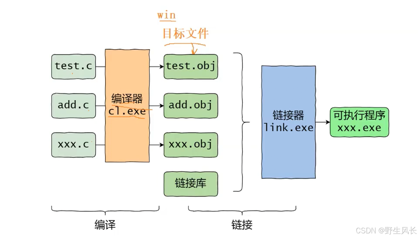 • 多个.c⽂件单独经过编译器,编译处理⽣成对应的⽬标⽂件。