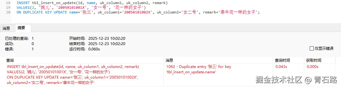 1062 - Duplicate entry '张三' for key 'tbl_insert_on_update.name'