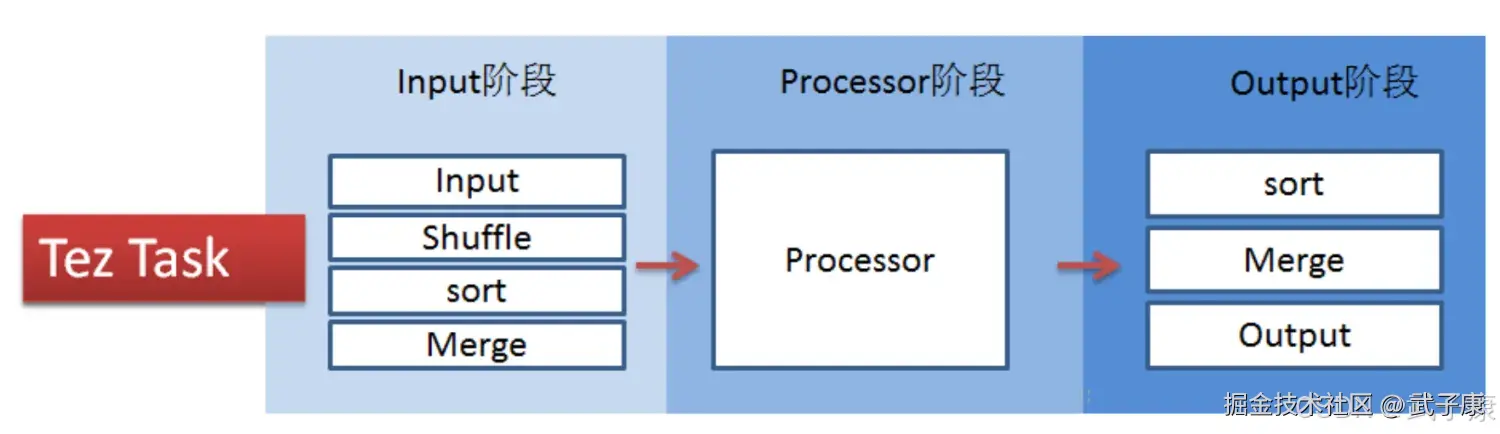 Tez的Task由Input、Processor、Output阶段组成,可以表达所有复杂的Map、Reduce操作,如下图所示: