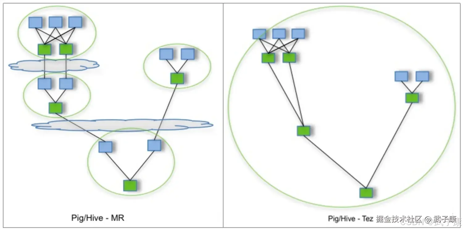 - 场景:Hadoop2/YARN 生态中用 Tez 替代 MapReduce,给 Hive/Pig 提速。