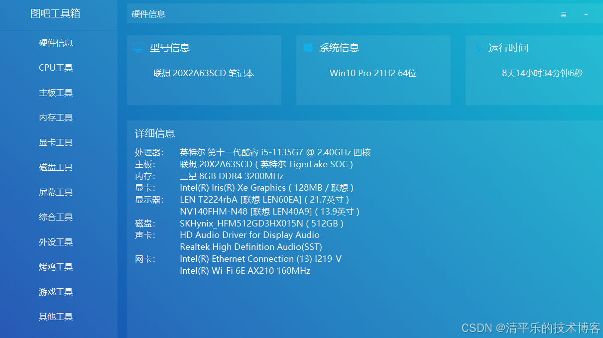如果大家想要查看基础的硬件信息,可以直接点击左上角"硬件信息"打开查看。