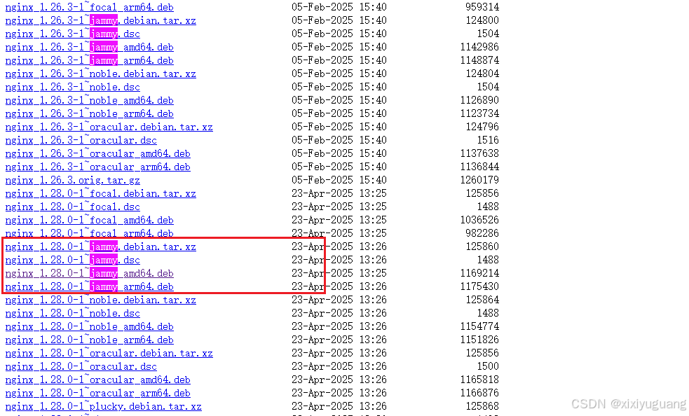 打开 https://nginx.org/packages/ubuntu/pool/nginx/n/nginx/,选择jammy版本、对应架构(amd64/arm64)的 deb 包;