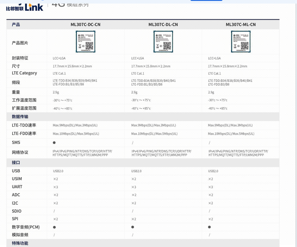 | 参数 | 4G | 5G | Cat1 | 2.4G WiFi |