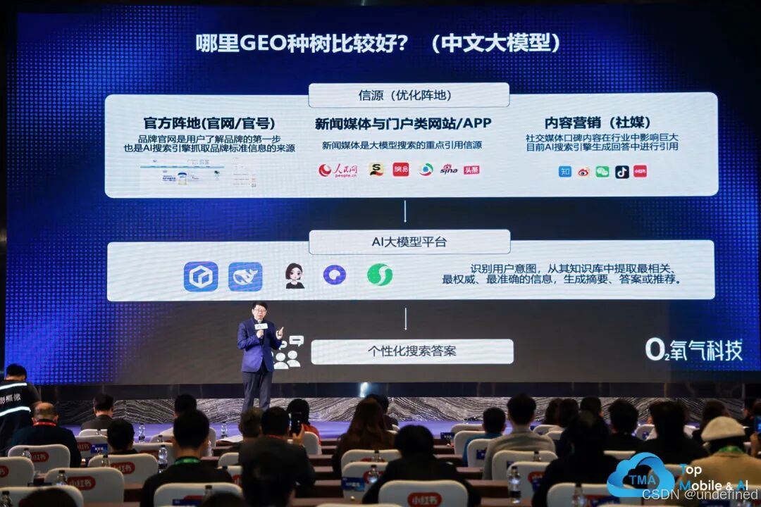12月19日,以"AI生万物,移往无前"为主题的2025 TMA盛典 在广州富力丽思卡尔顿酒店举行。作为移动营销与人工智能领域的重要行业盛会,本届大会围绕AI对内容生产、传播机制与品牌增长逻辑的深度影响,设置主题演讲、案例分享及颁奖等多个环节,吸引了来自平台、品牌、技术公司与研究机构的多方代表参与。来自百度、小红书、网易传媒、京东、字节跳动公益、知乎、微博、图派广告、巨量引擎等企业的20余位专家分享前沿洞察,氧气科技创始人、CEO 董浩宇博士 在会上作主题发言,系统性地剖析了生成式AI如何重塑用户搜索行为,颠覆传统付费搜索的底层逻辑,并首次详尽分享了氧气科技独创的生成式引擎优化(Generative Engine Optimization, GEO)实战方法论。