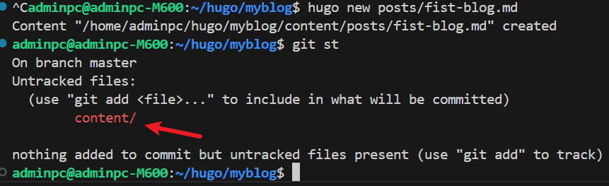 可以看到 Hugo 自动创建 content/ 文件夹,并在里面创建 posts/ 路径,其实不管是 content/posts/,还是 content/blog,Hugo 都能正确生成页面,Hugo 不关心目录叫什么,它只按 content/ 下的结构生成网站