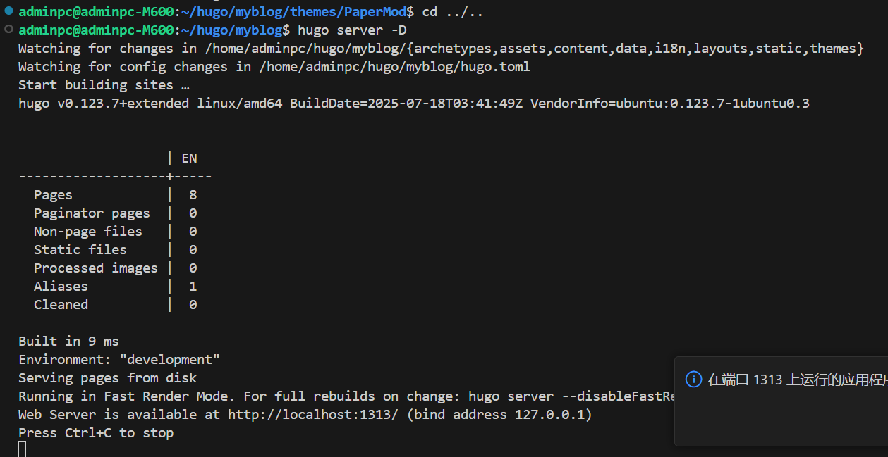 回到主仓库,再次输入 hugo server -D,可以看到运行成功