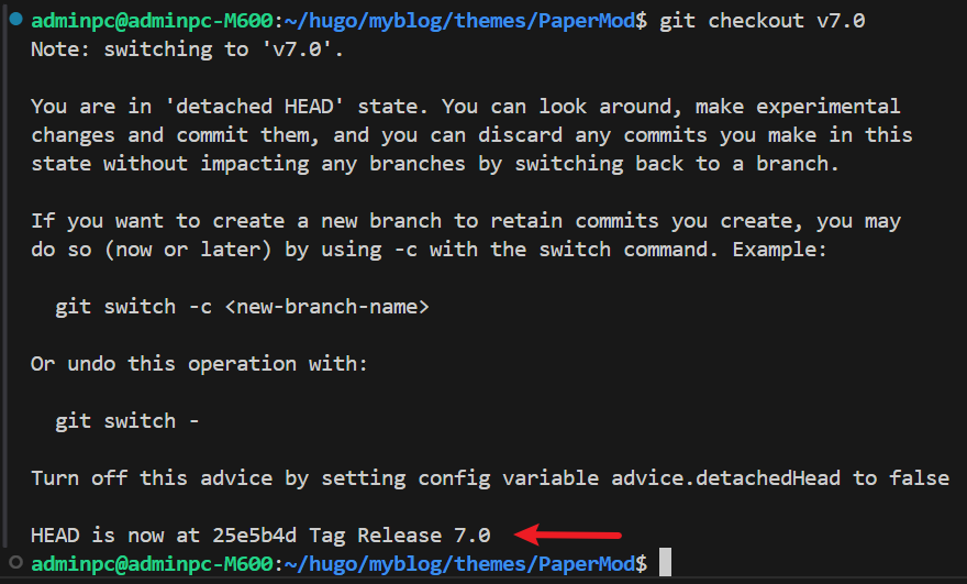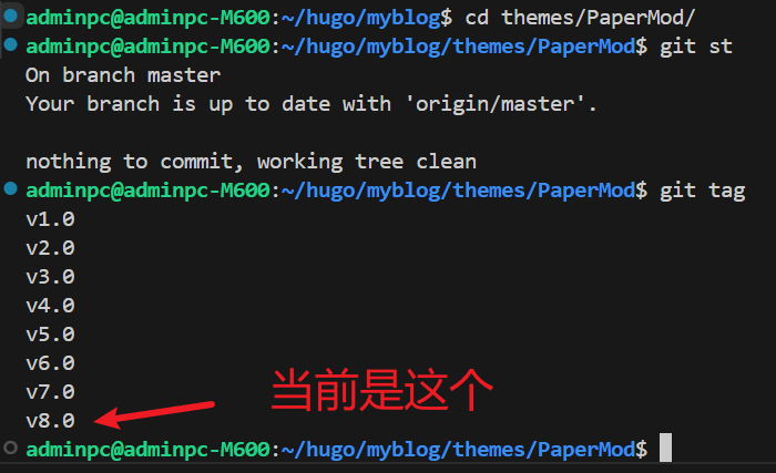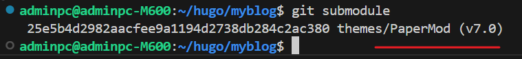 输入 git submodule,可以看到主仓库关联的 PaperMod 已经变成了 v7.0
