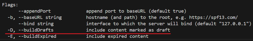 这里有个 -D 选项说下 ,-D 或 --buildDrafts 选项会让 Hugo 在本地预览时,也构建显示那些被标记为 draft 草稿的文章,在 Hugo 中,每篇文章的前置元数据里可以设置该文章是否为 draft 草稿,比如