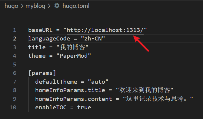 这里 localhost:1313 就是之前在 hugo.toml 配置文件中设置的 baseURL