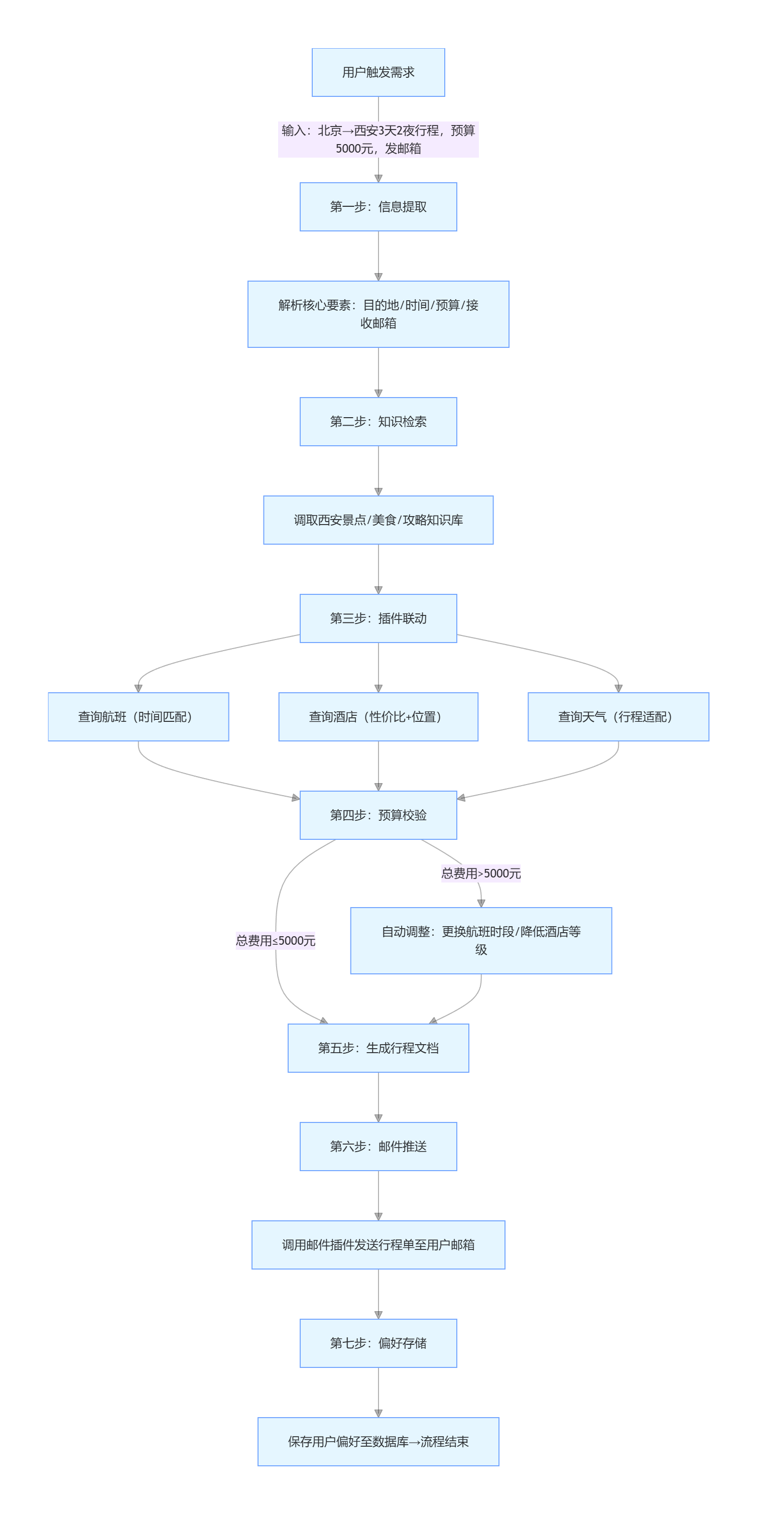 假设用户向智能体提出需求:"帮我规划下周末从北京出发去西安的三天两夜行程,预算 5000 元,包含机票、酒店和景点推荐,规划好后直接发送到我的邮箱。" 这类复杂需求无法通过单一步骤完成,需多环节协同: