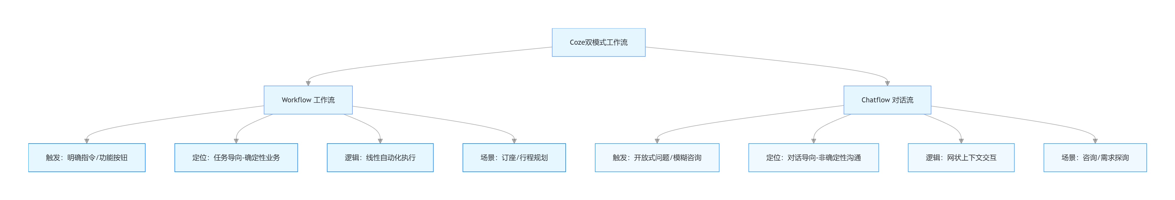 Coze 平台提供 Workflow 与 Chatflow 两种核心工作流模式,针对不同业务场景的需求特点,实现精准适配,满足多样化智能应用开发需求。