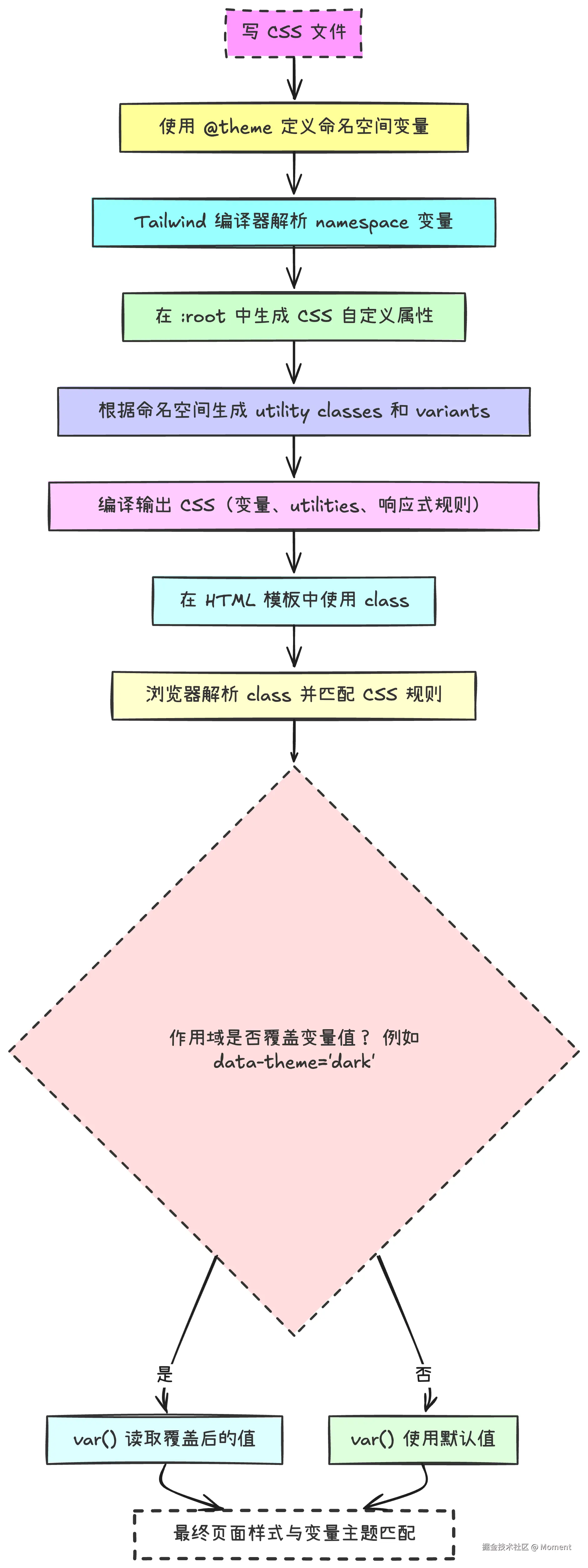 在 Tailwind CSS v4 中,theme variables(设计变量或主题变量)与页面样式之间的映射关系是一个值得深入理解的核心机制。本文将从底层原理、生成阶段、作用域和命名空间等维度,详细解析变量是如何一步步与页面和 class 建立起映射关系的。