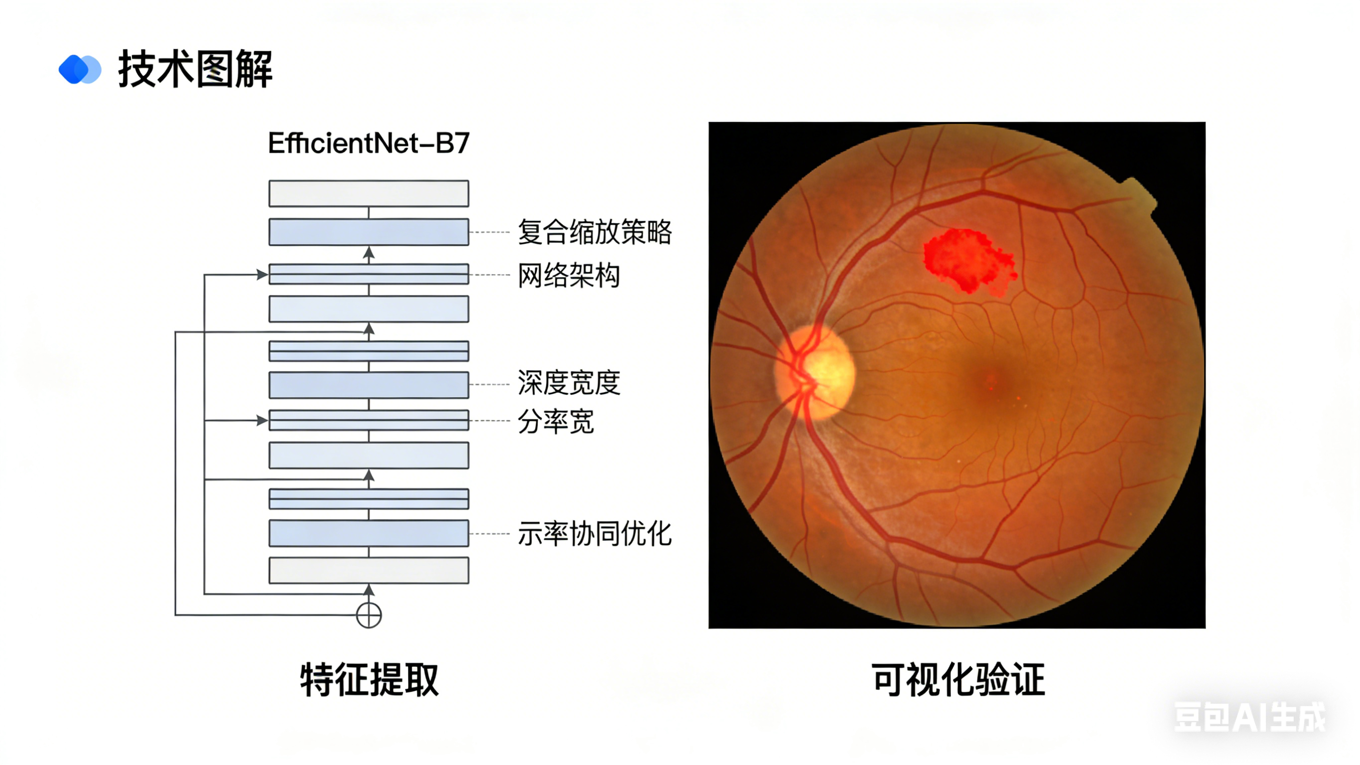选择EfficientNet-B7作为核心检测网络,核心在于其独特的"复合缩放策略"------不同于传统CNN仅单一放大网络深度、宽度或输入分辨率,该架构通过统一的缩放系数,协同优化三者维度。这种设计让模型在相同计算量下,能捕捉更丰富的眼底图像细节(如微血管瘤、硬性渗出等病变特征),为高准确率提供底层支撑。相较于ResNet、VGG等传统架构,EfficientNet-B7在医疗图像检测任务中,既能减少冗余计算,又能提升小病灶的识别能力。